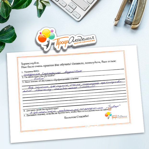 Я в восторге, давно не училась, было страшно начинать, но когда начала обучение, понравилось, все доступно, текст понятен, очень хотелось после чтения задания сразу пройти тест. Персонал академии выслал все документы на почту. Спасибо всем с кем я общалась во время обучения. Дальнейших успехов в работе.
